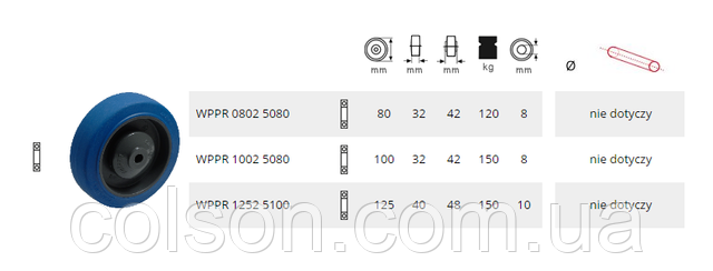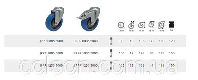 Колесо із синім пружним протектором Performa. Колесо із сірого пластику із синім гумовим протектором Performa зі стаціонарним кулькопідшипником. Робоча температура: -20 °C/+80 °C Твердість протектора: 65 за Шором