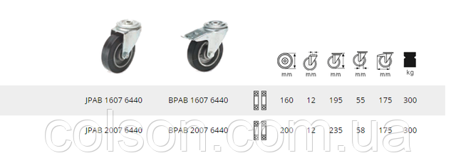 Колеса та ролики цієї серії використовуються на візках — платформи для перевезення важких вантажів. Вантажопідіймальність: 300 кг Диск з алюмінію з чорним еластичним гумовим протектором Алюмінієві колеса з гнучким гумовим протектором високої якості, з двома кульковими підшипниками. Робоча температура: -20 °C/+80 °C Протектор твердість 72 ° за Шором А.