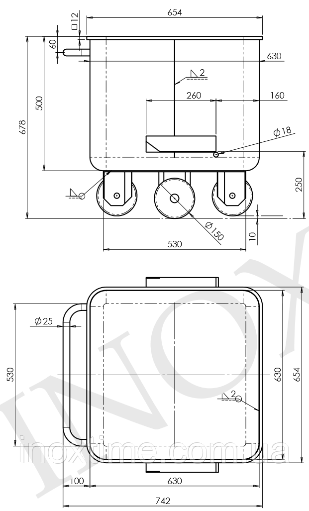 Виготовляється з нержавіючої сталі AISI 304 товщиною 2 ммГабаритні розміри 635х635х665 мм. Дно, посилене цілісним листом 3 мм. Верхній борт виконаний з повнотілої квадрата 12*12 мм Стандартний вага 40,0 кг. Комплектується поліамідними колесами Д-150 компанії Colson. Призначена для транспортування фаршу,кускового м'яса, напівфабрикатів,субпродуктів,засолу м'яса. Використовується в ковбасному виробництві для завантаження куттера ,дзиги,фаршемеса. Євро-візок буде незамінна в забійних цехах.При виробництві євро-візків використовується тільки харчова нержавіюча сталь,т. к. відбувається прямий контакт продукту з поверхнею візки.Внутрішні кути візки круглі, що дозволяє не затримуватися продукту при вивантаженні, а також сприяє поліпшенню якості мийки. Зварювальні шви суцільні, не відбувається затікання рідини у важко доступні для миття місця. Так само наша компанія виробляє візки інших обсягів.